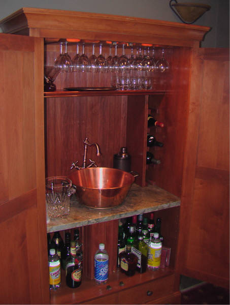 This wetbar made from an old armoire features a vintage copper basin sink, glass racks and overhead lighting