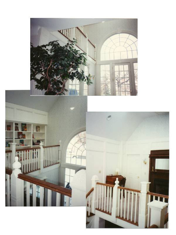 We installed all the Architectural Millwork and trim in this foyer and balcony including fabricating the upper window, install the antique mantle around a new fireplace, install antique rail and newal posts, and build the bookcases and stairway